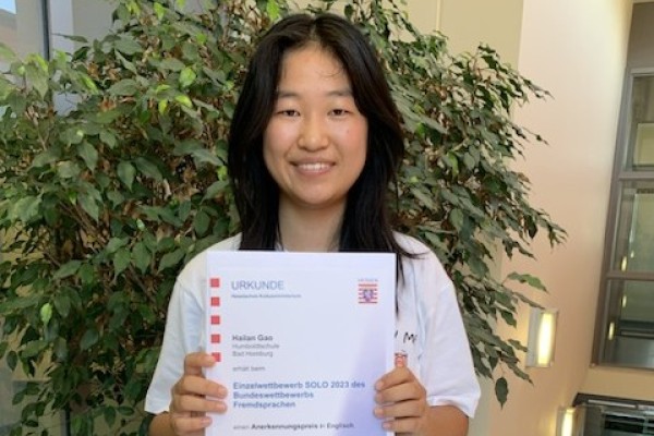 Hailan Gao aus der Klasse 10a hat sehr erfolgreich am Bundeswettbewerb Fremdsprachen im Fach Englisch teilgenommen, zum Thema “Time Machine” ein kreatives Video erstellt und darüber hinaus kommunikative Kompetenzen in allen Bereichen gemeistert, wozu eine schriftliche Arbeit über kulturelle, geopolitische und soziale Fragestellungen in Kanada angefertigt wurde.Die Jury hat Hailan eine ...11.07.2023