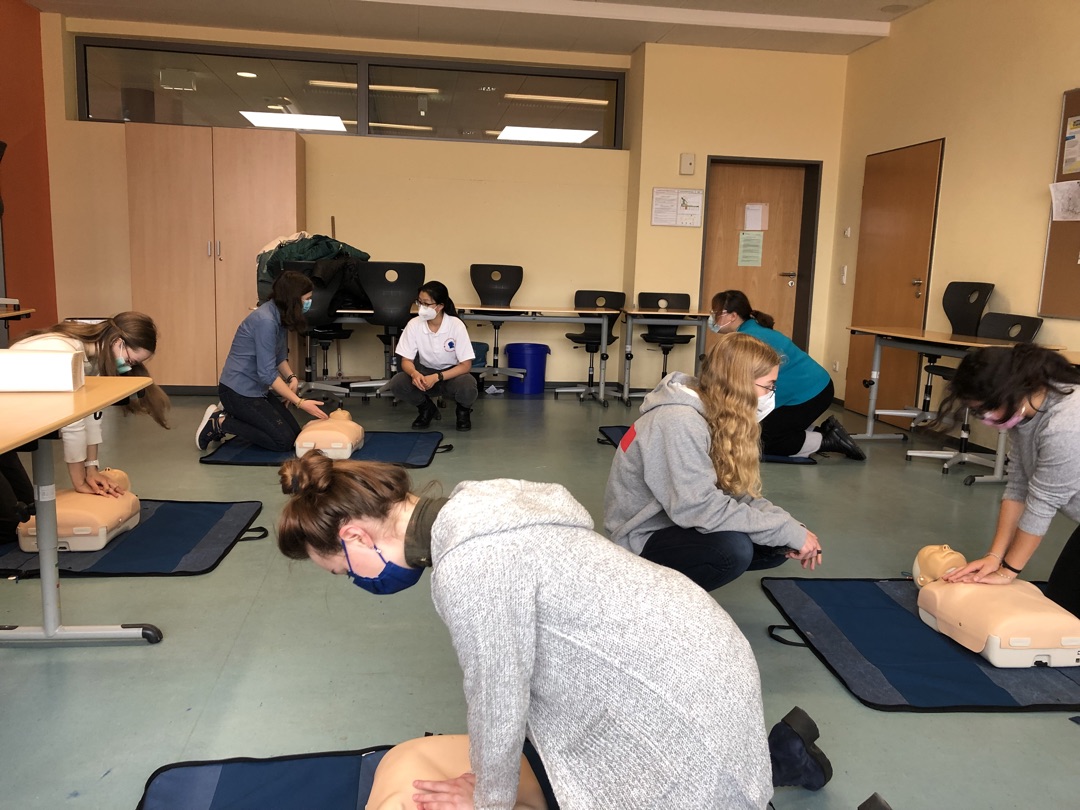Seit 25 Jahren engagieren sich Schülerinnen und Schüler an der HUS in Erster-Hilfe und stellen den Schulsanitätsdienst auf leistungsstarke Beine. In weitgehender Eigenorganisation schulen erfahrene und sehr gut ausgebildete Oberstufenschüler:innen in einer wöchentlich stattfindenden Sanitäts-AG jüngere Schüler:innen ab dem Jahrgang 7 in erster Hilfe. Gemeinsam mit Lehrer:innen sorgen sie in Pausendiensten, bei Schulveranstaltungen wie dem Sportfest, dem Tansaniabasar, dem Tag der offenen Tür und bei weiteren Schulfesten für eine zuverlässige und qualifizierte Erste-Hilfe. Das Jubiläum wurde vom momentanen Leitungsteam mit Alexander Masero, Vanessa Schreiber, Julia Wangler und Manman Wei am 11. November mit einem besonderen Schulungstag mit interessierten E-Phasenschüler:innen, dem Wahlpflichtkurs Erste-Hilfe und den AG- Schüler:innen begangen.
