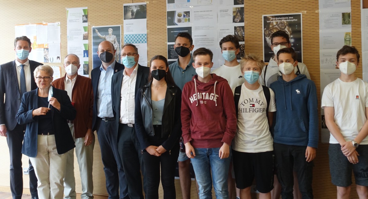 Als Höhepunkt des vom Fachbereich Latein organisierten und von der Deutschen Stiftung Denkmalschutz („denkmal aktiv“) und der Deutschen UNESCO-Kommission geförderten Projekts „Rom in Hessen – vom Pferdekopf aus Waldgirmes zum UNESCO-Welterbe Limes“ fand am 5.7.2021 eine Abschlussveranstaltung an der Humboldtschule statt. Auf dieser berichtete die Archäologin Frau Dr. Rasbach anschaulich darüber, wie sie mit vielen anderen Beteiligten den vergoldeten Pferdekopf, Teil einer Reiterstatue des römischen Kaisers Augustus und heute im Saalburgmuseum zu sehen, aus einem 11 Meter tiefen Brunnen in der römischen Siedlung Waldgirmes (Nähe Wetzlar) ausgegraben hat.