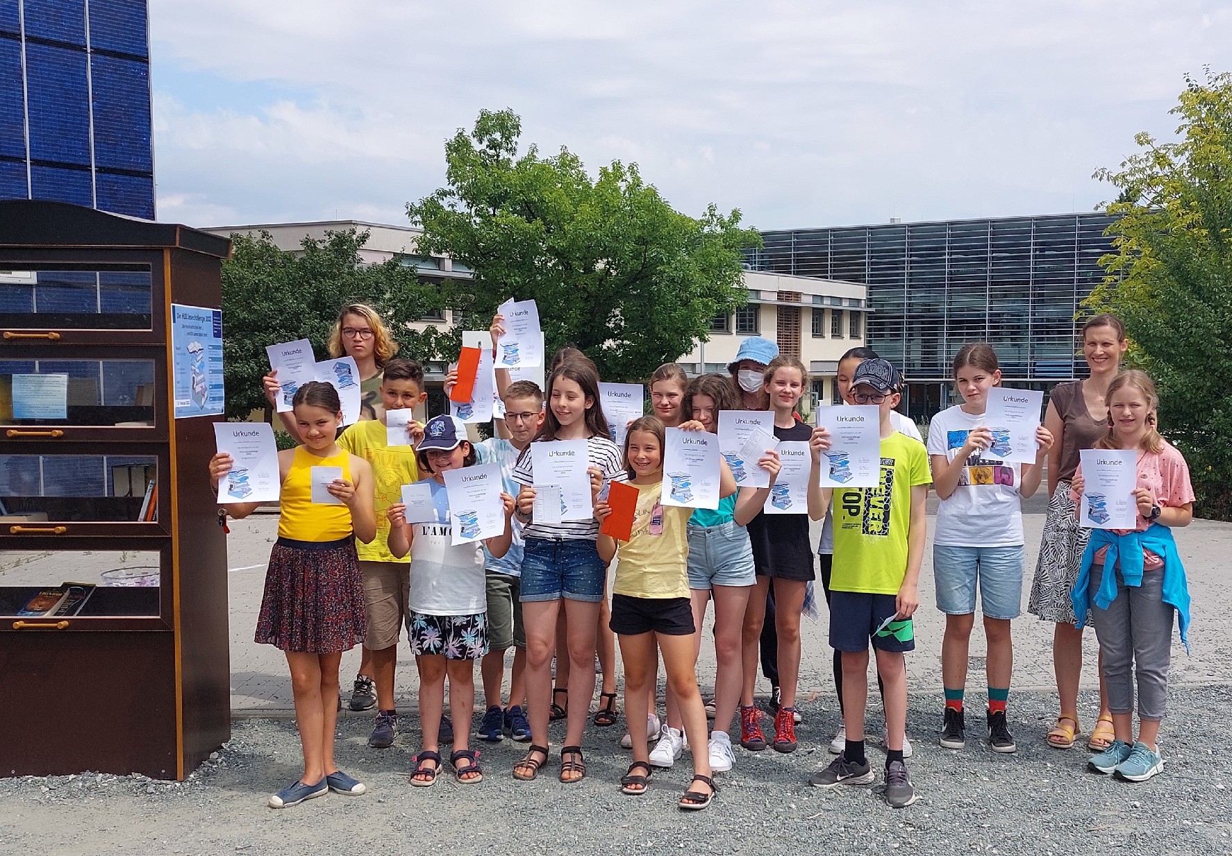 Am 14. Juli haben Frau Balestra und Frau Becker dann am Bücherschrank diverse Preise in Form von Gutscheinen fürs Kino, den Kletterwald, Bowling, Fußballgolf etc. verlost und Urkunden an die erfolgreichen TeilnehmerInnen verteilt – keiner ging leer aus.