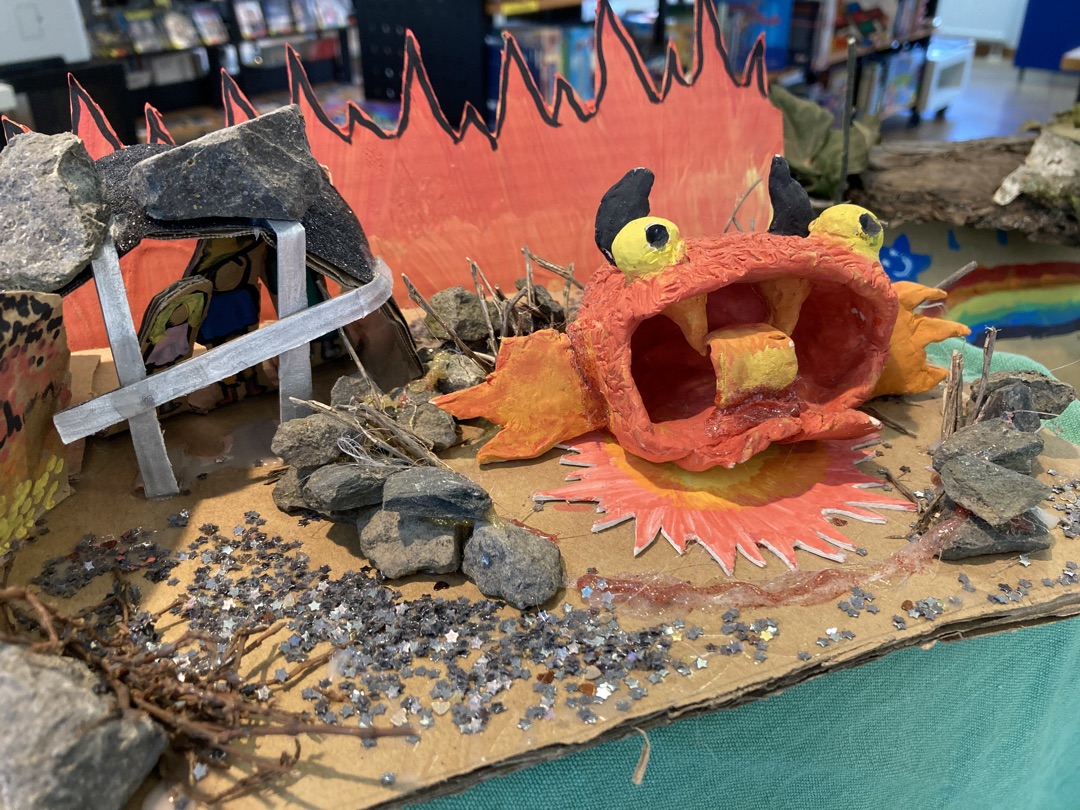 Die Schüler*innen in Klasse 5 gestalteten Drachenbabys vor dem Hintergrund mittelalterlicher Sagen. Dabei arbeiteten sie mit Ton. Aus der Basis eines einfachen Daumenschälchens, einer Grundtechnik des plastischen Gestaltens, wurden zunächst Mäuler mit Zähnen geformt. Hinzu kamen Augen, Schuppen, Beine, Arme und manchmal sogar Flügel. Frei assoziativ entwickelten die Kinder so eigene Fantasiewesen. Manche bauten ihnen sogar aufwändige Höhlen als Unterschlupf.