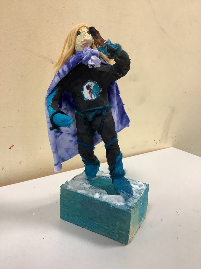 Mit welcher Superkraft könnte dem wahnwitzigen Megaschurken Dr. Krummblick das Handwerk gelegt werden? Mit dieser Frage startete das Kunstprojekt der Klassen 6. Mit Hilfe von Skizzen und fiktiven Steckbriefen entwickelten die Schüler*innen eigene Charaktere. Inspiration für ihre Figuren fanden sie unter anderem durch die Betrachtung antiker Statuen und die Frage, wodurch eine Pose ausdrucksstark wirkt.