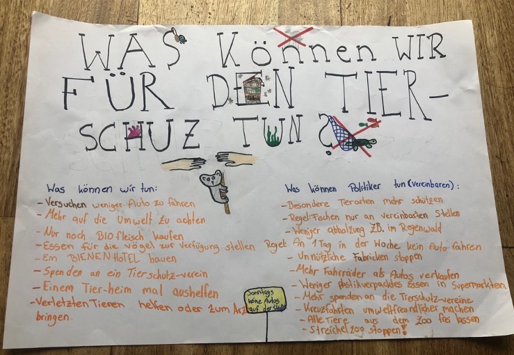 Auch im Fach Religion ist der UNESCO-Bezug zu einem nachhaltigen Umgang mit der Umwelt curricular verankert. Die Schüler:innen des katholischen Religionsunterrichts der Klassen 5dfgh haben sich in der Auseinandersetzung mit den biblischen Schöpfungserzählungen auch mit der Verantwortung des Menschen gegenüber seiner Um- und Mitwelt beschäftigt. Tiere als Teil der Schöpfung bedürfen eines besonderen Schutzes. In diesem Kontext haben die Schüler:innen konkrete Vorschläge und Ideen entwickelt, wie sich Menschen für einen verantwortungsvollen Umgang mit Tieren und ihrem Lebensraum einsetzen können.