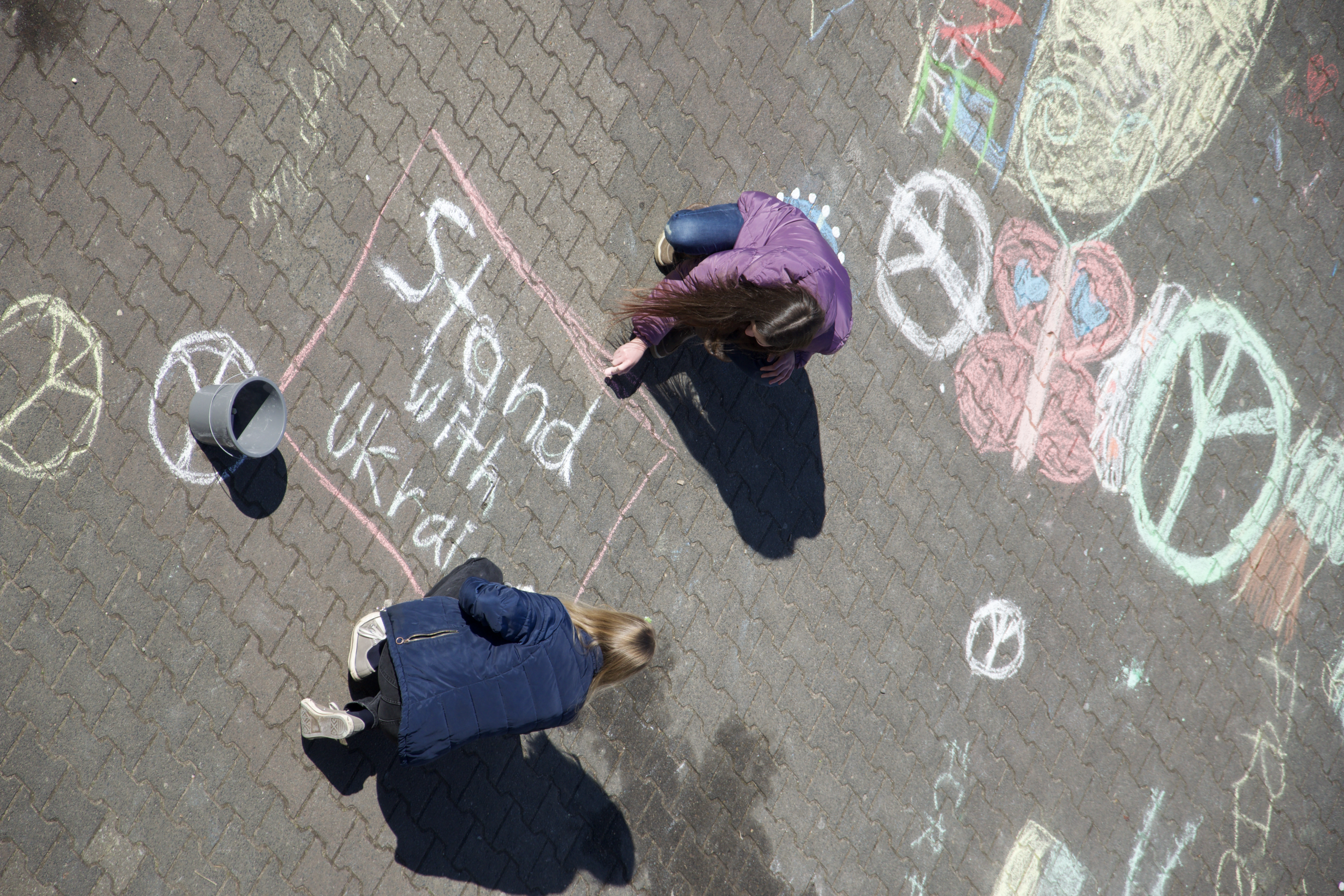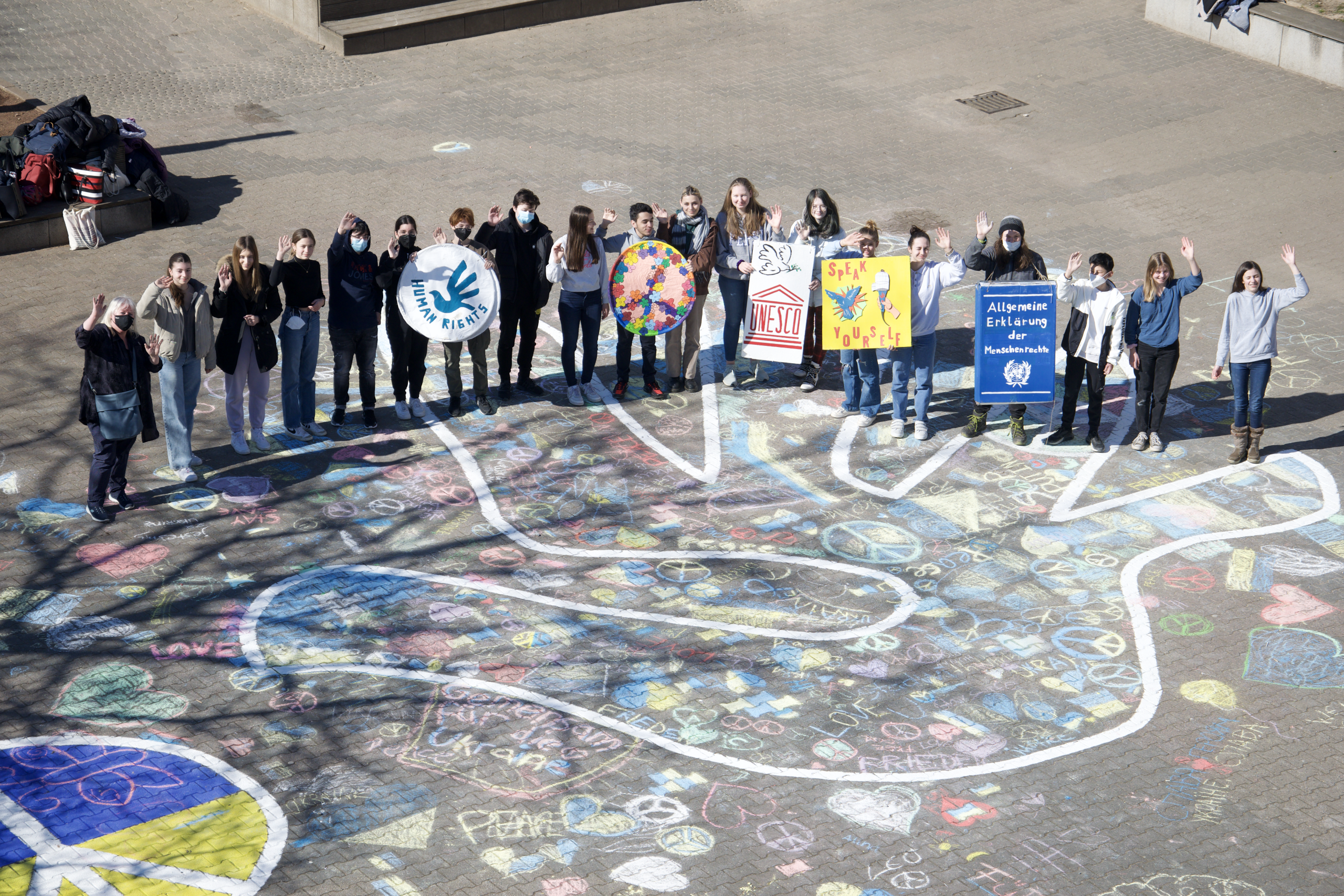10:30 Uhr_Es ist ungewöhnlich voll auf dem Schulhof der Humboldtschule. Schülerinnen und Schüler ab der 7. Klasse dekorieren, tragen Musikinstrumente und installieren Technik, alles für den bevorstehenden Auftritt der Lehrerband und das gemeinsame Ausmalen des Menschrechtslogos auf dem Schulhof. Es geht darum, ein Zeichen zu setzen, ein Zeichen für den Frieden, ein Zeichen der Solidarität und ein Zeichen des Unmuts gegen Putins Angriffskrieg. Wir empfinden Mitgefühl für die ukrainische Bevölkerung, die unendliches Leid ertragen muss. Wir solidarisieren uns mit ihnen. Wir solidarisieren uns aber auch mit den mutigen Menschen in Russland, die gegen Putin protestieren.