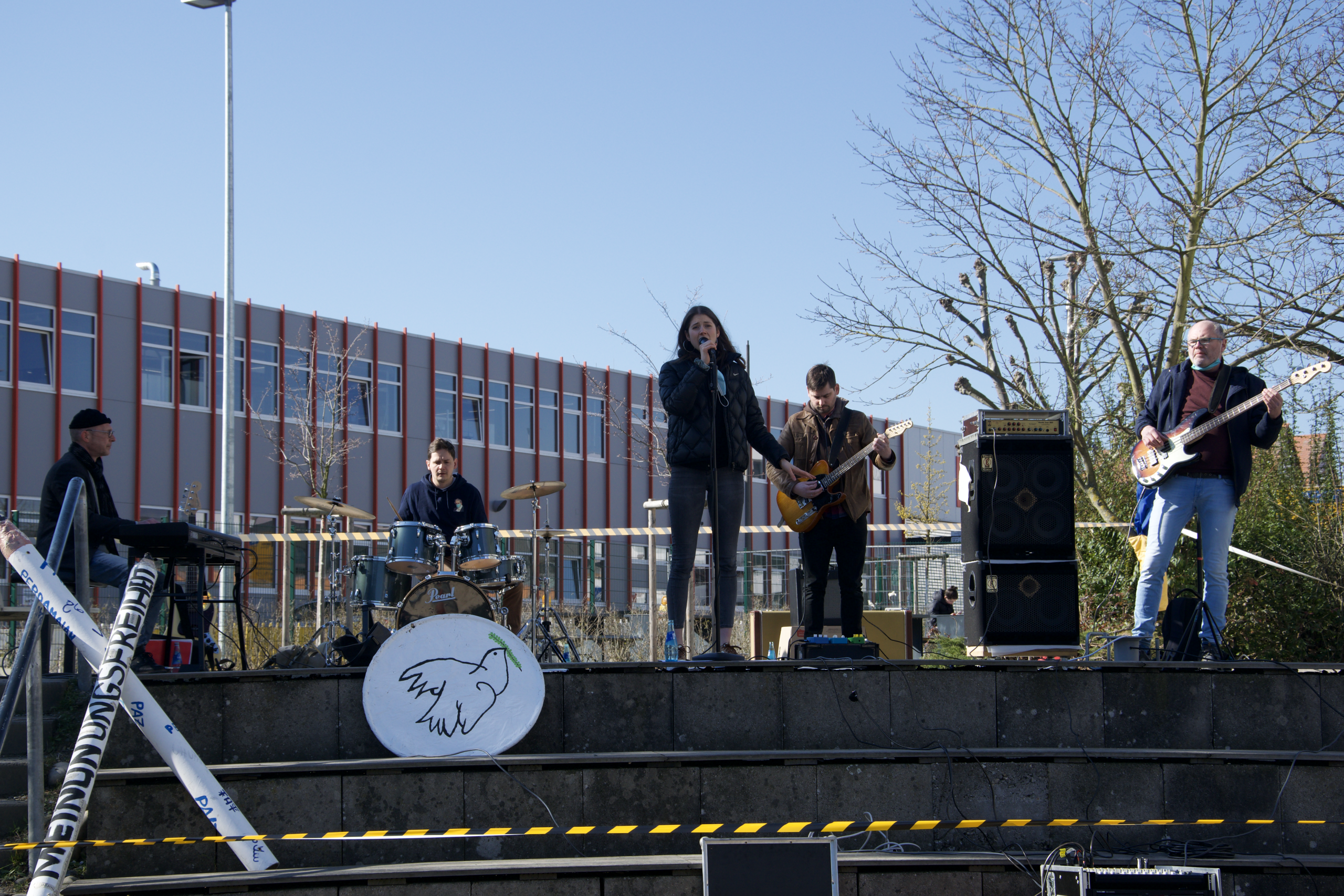 Seit Beginn des Krieges sind viele Schülerinnen und Schüler nachdenklich, traurig und hilflos. Sie haben Angst. Angst davor, dass der Krieg nach Deutschland kommt. Angst, die wir Lehrerinnen und Lehrer gut nachvollziehen können, denn auch wir kennen Krieg nur aus den Erzählungen unserer Großeltern und wer hätte gedacht, dass der Krieg noch einmal nach Europa kommt? Auch wenn die Ängste real sind, lässt sich damit einfacher umgehen, als mit den vielen Fragen und dem Unverständnis, das bei den Schülerinnen und Schülern vorwiegend vorhanden ist. Es fällt ihnen schwer zu begreifen, wieso Wladimir Putin so agiert. Auch uns Lehrerinnen und Lehrern fällt es schwer, diese Frage zufriedenstellend zu beantworten, da der Krieg gegen alles spricht, was wir den Schülerinnen und Schüler an der UNESCO-Projektschule vermitteln. Dies brachte auch der Bassist der Lehrerband Norbert Schmedt in seiner Rede am Mittwoch zum Ausdruck: „Wir sind eine UNESCO-Projektschule: als solche setzen wir uns für Menschenrechte, für die Einhaltung des Völkerrechts und für weltweite Gerechtigkeit ein; und wir sind eine Humboldtschule; als solche setzen wir uns dafür ein, Konflikte nicht mit Gewalt, sondern mit der Kraft der Sprache zu lösen. Dieser Krieg bombardiert auch all diese Werte, für die unsere Schule steht.“