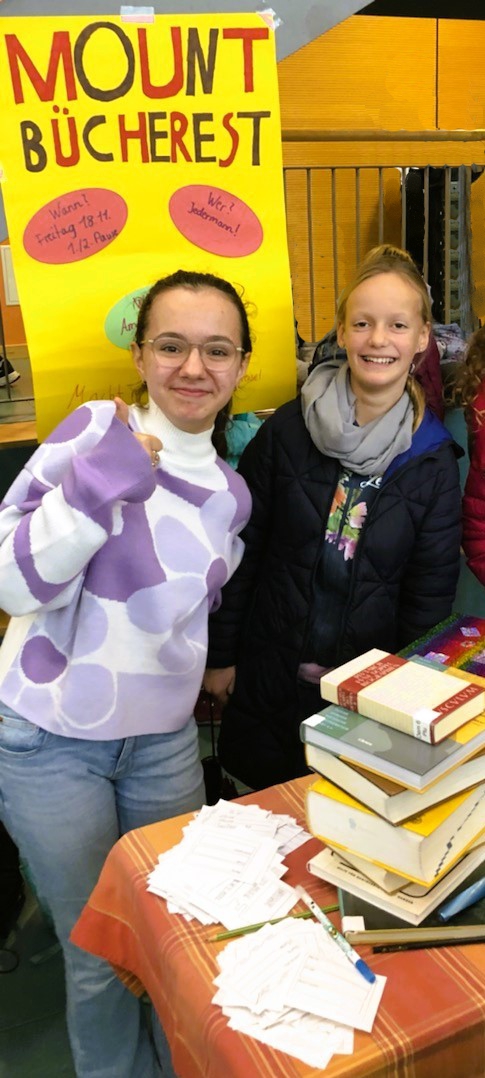 Zum Anderen gab es in beiden Pausen - erst in der Pausenhalle, dann am Bücherschrank - ein Gewinnspiel der Lesescouts! Der Mount Bücherest musste bezwungen werden. Über 100 Schülerinnen und Schüler haben geschätzt, wie viele Seiten der Bücherstapel umfasste. Den sechs Gewinner:innen werden am Dienstag im Unterricht die Geschenkbücher von den Lesescouts übergeben. Herzliche Glückwünsche gehen an: