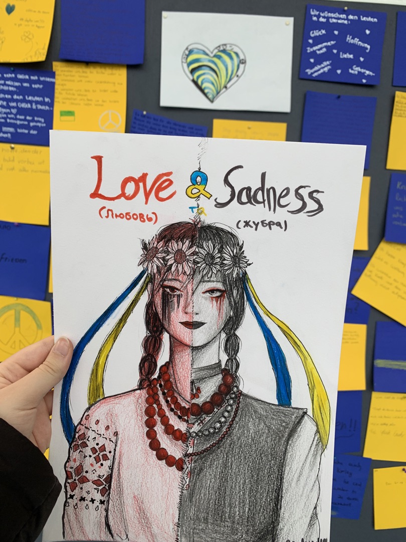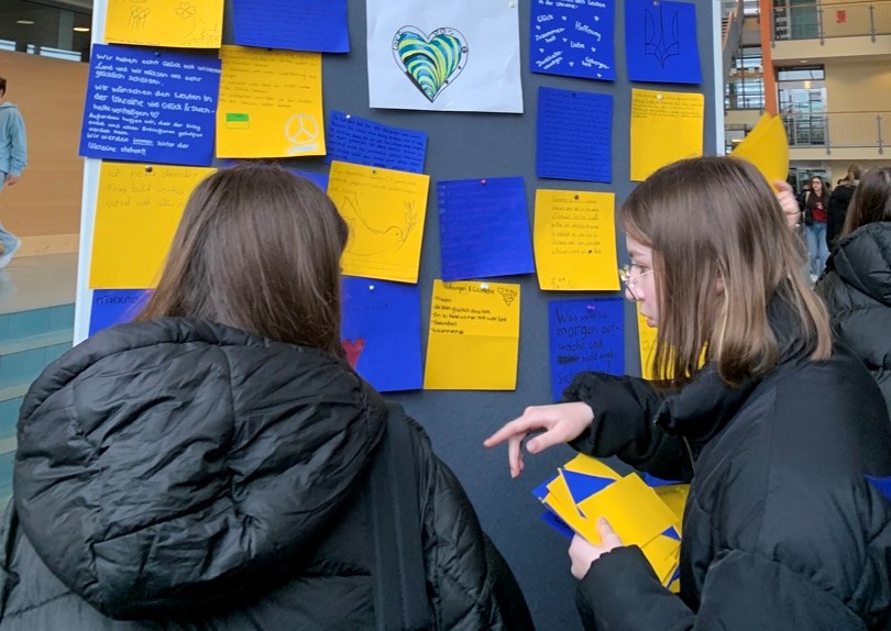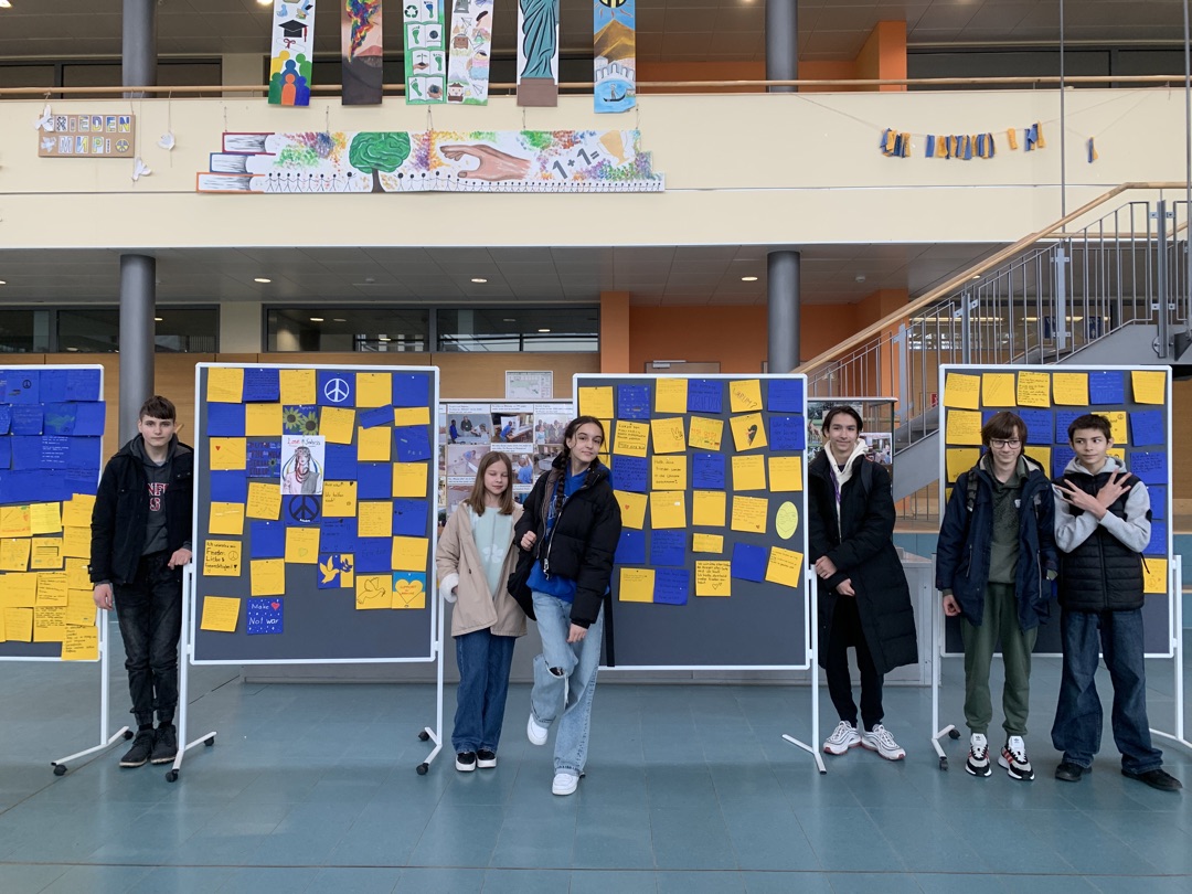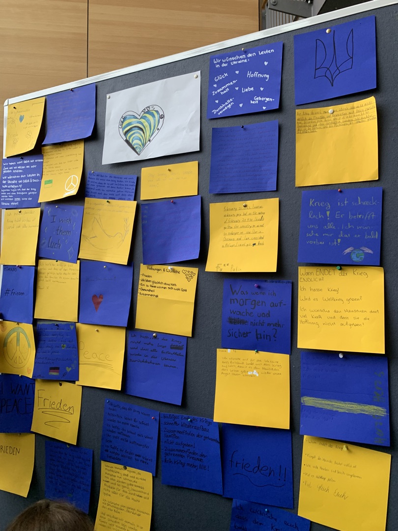 Anlässlich des ersten Jahrestages des russischen Krieges gegen die Ukraine haben unsere Schülerinnen und Schüler die Gelegenheit genutzt, ihre Gedanken, Wünsche, Sorgen und Ängste zu diesem Thema aufzuschreiben und zu gestalten. Eine wunderbar vielfältige "Ausstellung" ist dabei entstanden.