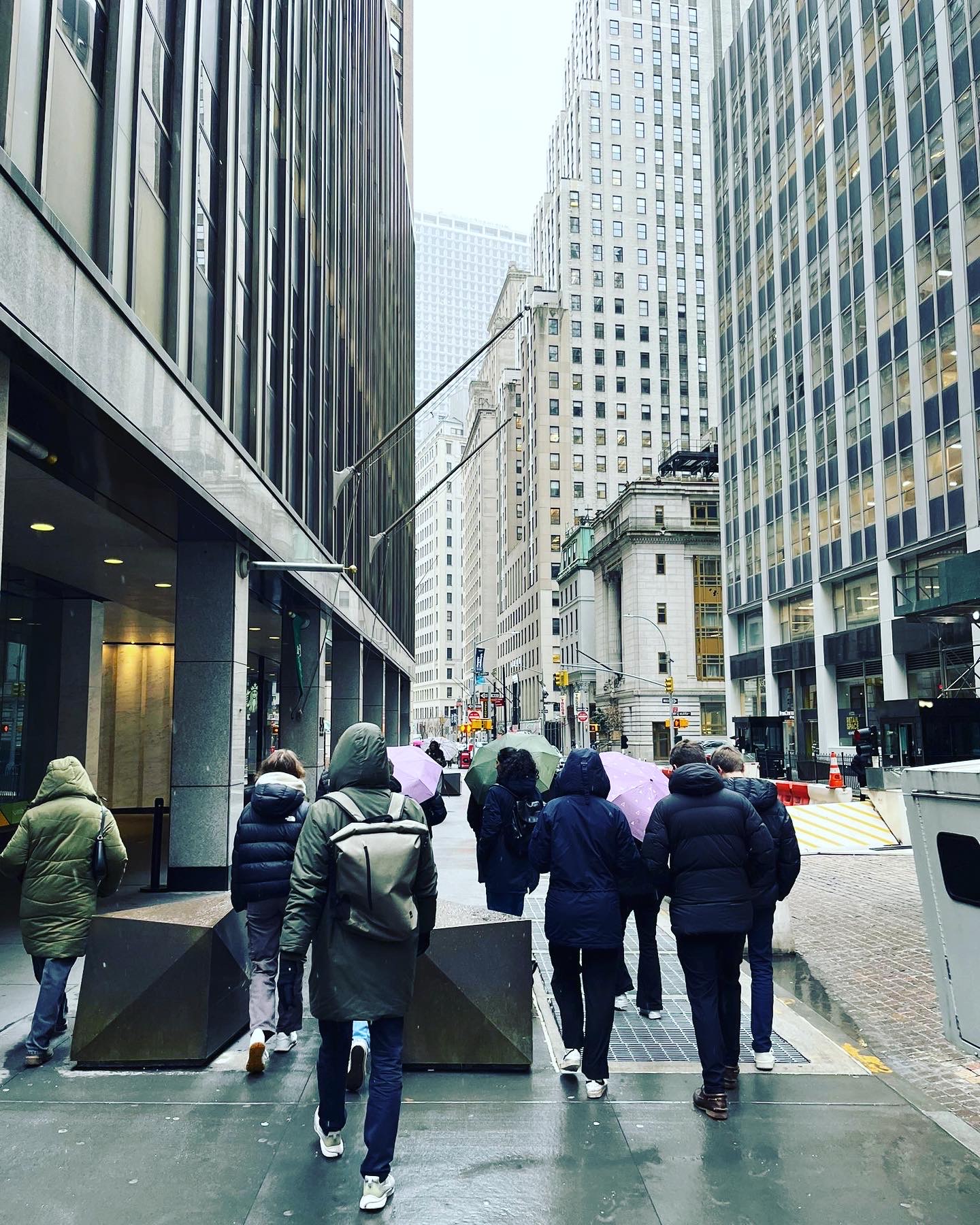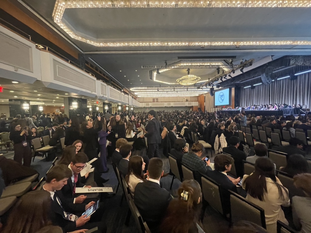 Dann, wenige Tage später: „Welcome to New York, it’s been waiting for you.“, sang Taylor Swift über die Lautsprecher unseres Reisebusses, als sich im dichten Nebel allmählich die Skyline des Big Apple abzeichnete. Der große Traum der Schülerinnen und Schüler wurde nun endlich wahr. Und mit der Entspanntheit der Hauptstadt, die für viele der Gruppe zu den schönsten Erinnerungen an die Fahrt zählten, war es dann endgültig vorbei. Sofort wurde spür-, hör- und sichtbar, dass sich im Verhältnis zu Bad Homburg knapp dreißigmal so viele Bewohner in die Straßen Manhattans drängten. Auch in unserer Unterkunft gab es wenig Rückzug, denn weit mehr als die Hälfte der zweitausend Betten des Hilton Hotel in Midtown New York war von Schüler:innen aus unzähligen Ländern der Erde belegt. Trotz des gut gefüllten Werkzeugkastens der weißrussischen Delegation wurde es zu einer echten Herausforderung, während der Komiteesitzungen das Wort erteilt zu bekommen. Und das Ganze dann auch noch auf Englisch!
