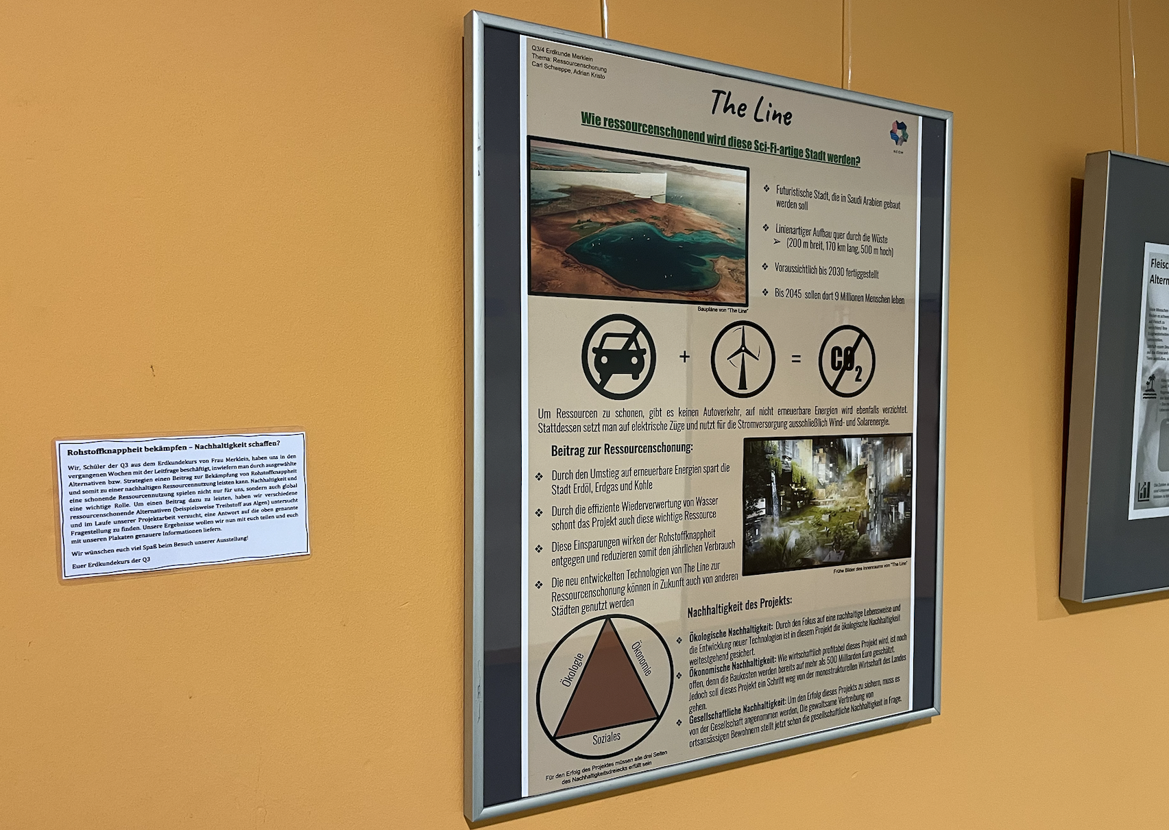 Ölknappheit, steigende Benzin- und Lebensmittelpreise und leere Supermarktregale. Die globale Nachfrage nach Rohstoffen wächst und die Auswirkungen von Rohstoffknappheit betreffen uns alle. Wir, die Schüler der Q4 aus dem Erdkundekurs von Frau Merklein, haben uns in den vergangenen Wochen mit der Leitfrage beschäftigt, inwiefern man durch ausgewählte Strategien und Alternativen einen Beitrag zur Bekämpfung von Rohstoffknappheit und somit zu einer nachhaltigen Ressourcennutzung leisten kann. Nachhaltigkeit und eine schonende Ressourcennutzung spielen nicht nur für uns eine wichtige Rolle, sondern gewinnen auch global immer mehr an Relevanz. Um hierzu einen Beitrag zu leisten, haben wir eine ressourcenschonende Alternative (beispielsweise Treibstoff aus Algen) einzeln oder in Gruppen näher untersucht und im Laufe unserer Projektarbeit versucht, eine Antwort auf die oben genannte Fragestellung zu finden. Unsere Ergebnisse haben wir auf digital erstellten Plakaten zusammengefasst und veranschaulicht. Diese wollen wir, auch im Rahmen des Unesco-Schwerpunkts der HuS, gerne mit der Schulgemeinde teilen. Wir laden euch daher herzlich ein, die Ausstellung zu besuchen. Ihr findet sie im Erdgeschoss des C-Baus vor Raum C009. Ihr könnt dort ebenso einen Eindruck von der Themenvielfalt des Erdkundeunterrichts in der Oberstufe bekommen.