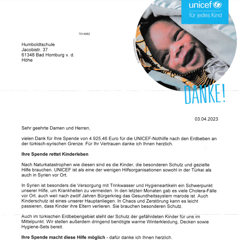 Nach knapp zwei Wochen hatte die Humboldtschule 4925,46 Euro einsammeln können, um den direkt Betroffenen in diesem düsteren Abschnitt ihres Lebens einen Wiederaufbau zu ermöglichen. Die Schulleiterin Frau Klein-Jänsch und das UNESCO-Forum bedankten sich bei allen beteiligten Schülern*innen. Die gesamte Summe wurde an UNICEF – Soforthilfe Erdbeben Türkei/Syrien überwiesen.