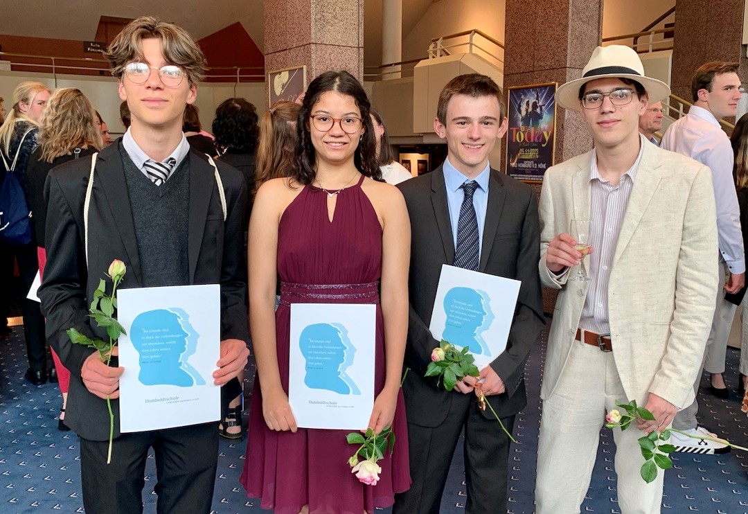 Dieses Jahr haben vier Schülerinnen und Schüler der Humboldtschule das "Abibac" gemeistert, also das deutsch-französische Abitur (von links nach rechts): Païlag Roger, Melissa Celestino Morris, Mathieu Lévêque, Arev Roger. Félicitations!