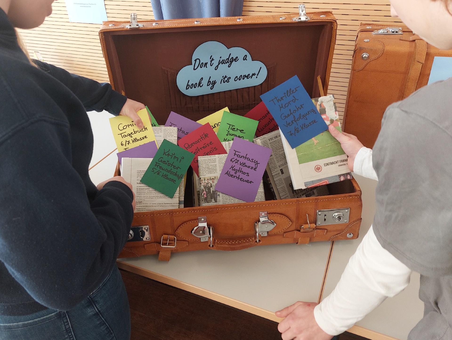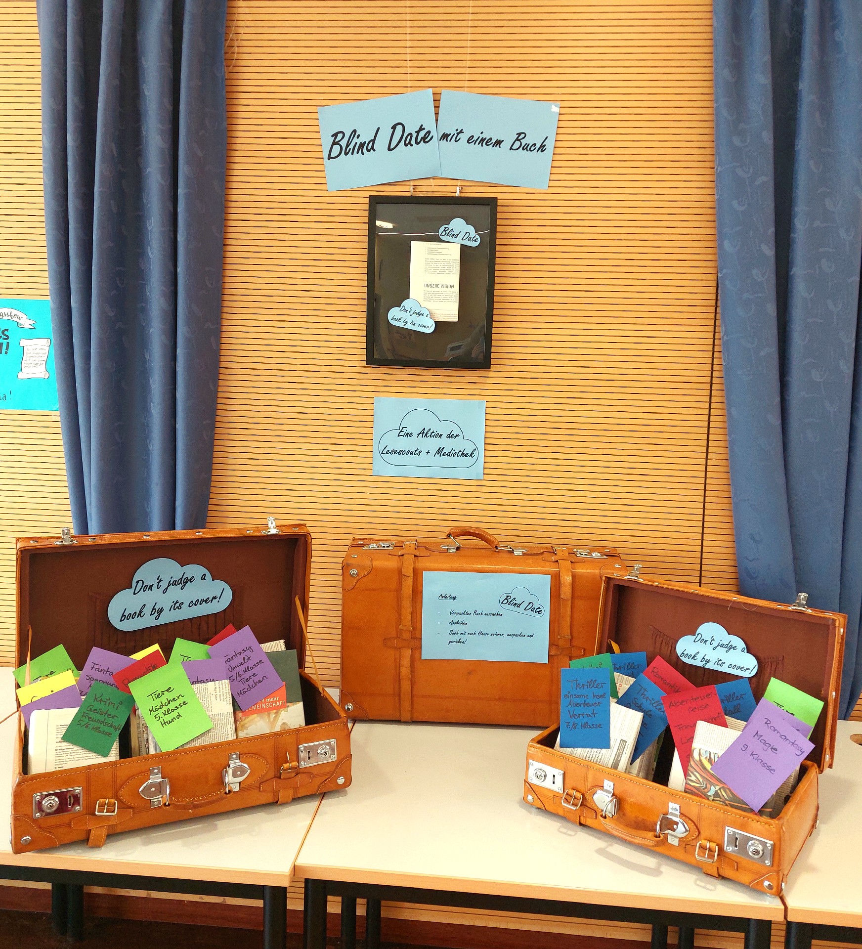 In der sehr schön dekorierten Ecke mit den Blind Dates stöbern schnell nach dem Bekanntgeben der Aktion mit Spannung und Vorfreude Schülerinnen und Schüler in den alten Koffern mit den eingepackten Büchern. Wie kleine Geschenke warten diese darauf, entdeckt zu werden. Hinweise geben nur Zettelchen auf den Umschlägen, die das Genre verraten sowie die empfohlene Klassenstufe und ein Themenstichwort.