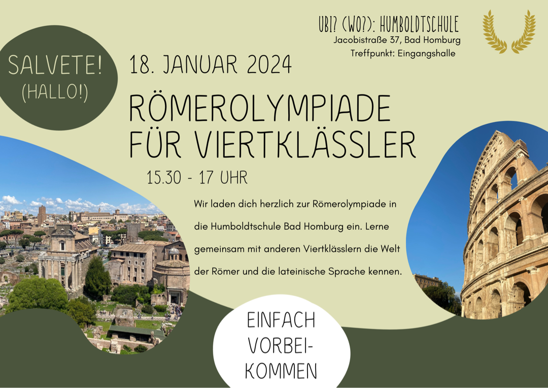 Die Lateinlehrerinnen und Lateinlehrer der Humboldtschule Bad Homburg laden alle interessierten Grundschülerinnen und Grundschüler der vierten Klassen und auch ihre Eltern am Donnerstag, den 18.01.2024, von 15.30 bis 17.00 Uhr herzlich zu einer „Römerolympiade“ ein. Bei Workshops zu Gladiatoren und Göttinnen und Göttern sowie verschiedenen Spielen können die Kinder die Welt der Antike und die lateinische Sprache kennenlernen. Außerdem werden römische Köstlichkeiten angeboten. An unserem Infostand beantworten die Lateinlehrerinnen und -lehrer auch gern Fragen zum Fach Latein an der Humboldtschule.