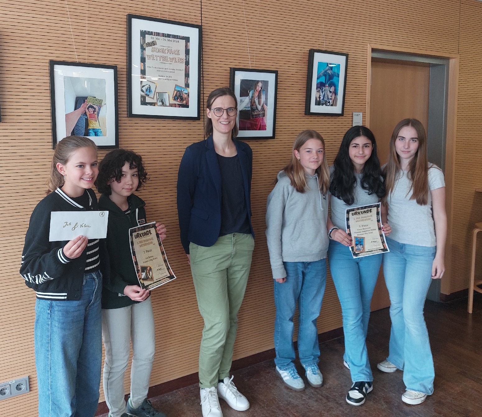 1. **Elena, Majinovic, Theresa Nelles und Naamat Bou Imad (6a)**: Das Team beeindruckte mit ihrem kreativen Ansatz zum Buch "Samurai" und übertrug die düstere Atmosphäre des Covers direkt in die Wirklichkeit.