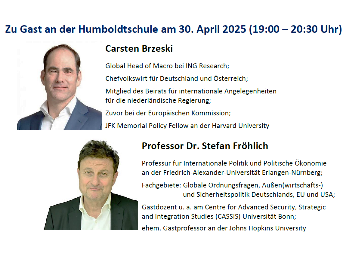 Zwei hochkarätige Experten, Herr Carsten Brzeski (Global Head of Macro bei ING Research) und Professor Dr. Stefan Fröhlich (Professor für Internationale Politik und Politische Ökonomie an der Friedrich-Alexander-Universität Erlangen-Nürnberg), gewährten den Schülerinnen und Schülern und interessierten Gästen spannende Einblicke in ökonomische und geopolitische Zusammenhänge. Moderiert wurde die Veranstaltung von der Oberstufenschülerin Mayleen Watzinger und dem Lehrer sowie Initiator des UNESCO-Diskussionsforums Dr. Torben Waschke.
