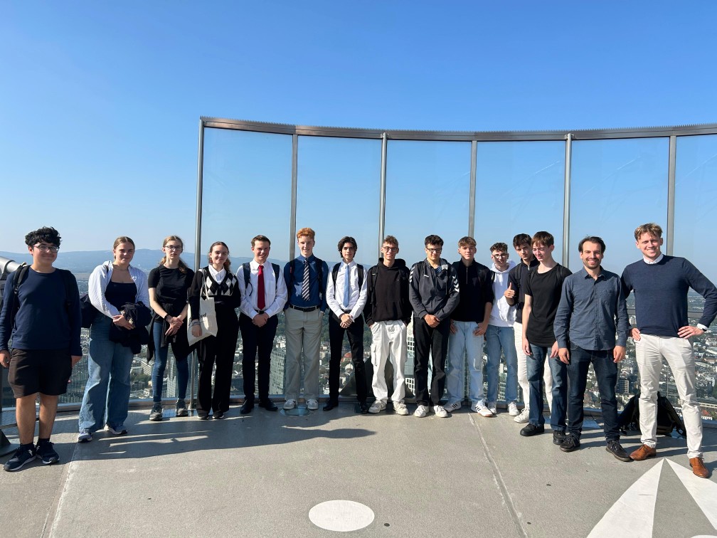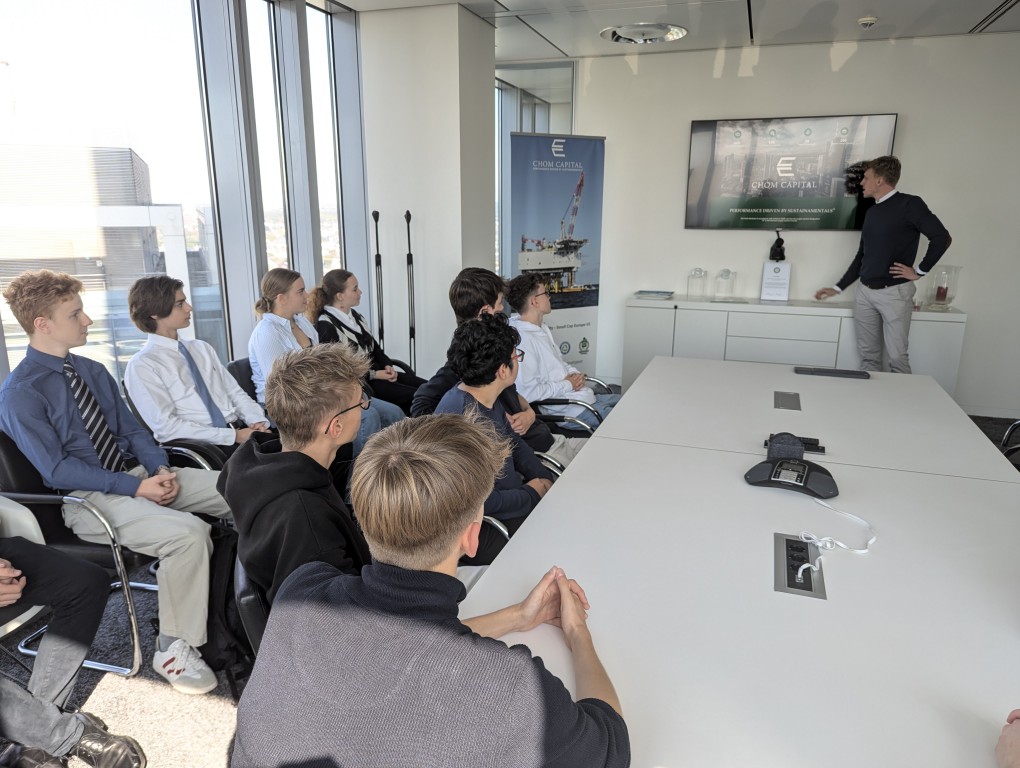 Der Physik OK Schmitt hatte in der Fahrtenwoche die Möglichkeit, CHOM Capital im Main Tower zu besuchen. Bei der Exkursion ging es um die Frage, wie Fonds heutezutage Nachhaltigkeitskriterien bei ihren Investmententscheidungen mit berücksichtigen können. Ben Kirsch vom Fonds CHOM Capital gab dabei Einblicke, wie die Wertschöpfungskette bspw. bei Offshore Windkraft-Unternehmen genau betrachtet wird und dann gezielt Investmententscheidungen in nachhaltige und lukrative Unternehmen getroffen werden können. Der Kurs konnte dabei Eindrücke über den Tellerrand des klassischen Schulunterrichts hinaus sammeln, auch zum Arbeitsalltag eines Fondsmanagers konnten Fragen gestellt werden.