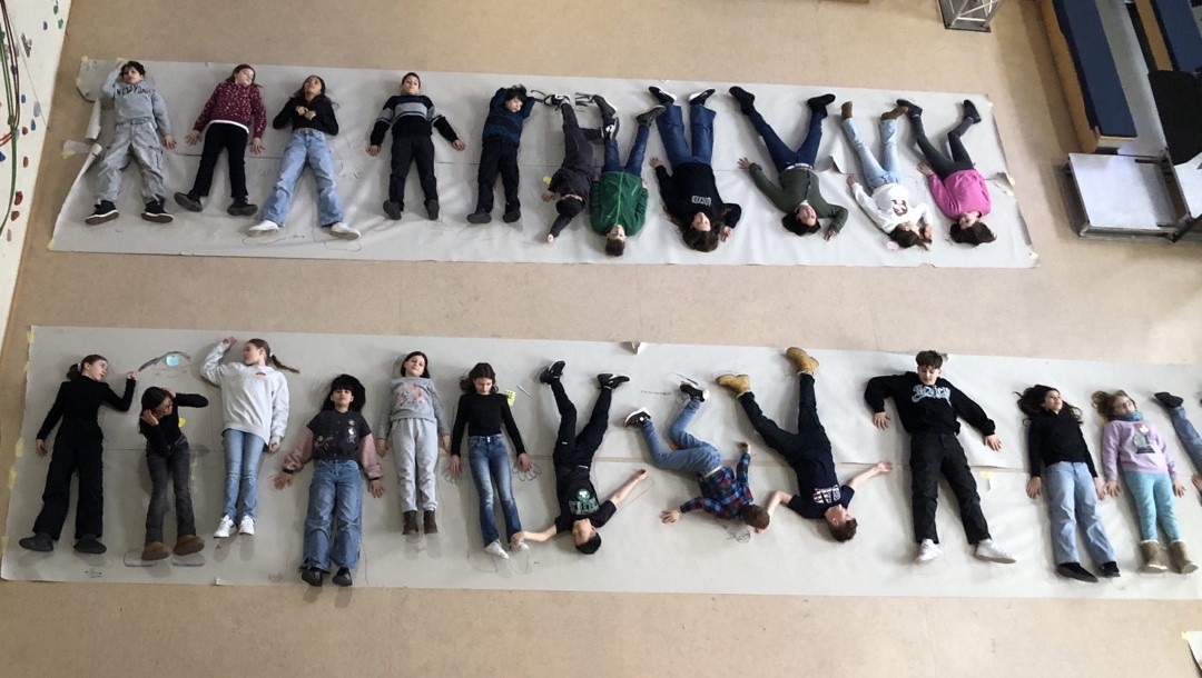 Nach der Pause ordnete jedes Kind sich seine positive Eigenschaft zu und benannte gleichzeitig für einen zufällig ausgewählten Mitschüler eine weitere positive Eigenschaft. Diese Übung stärkte das Selbstbewusstsein und das Miteinander in der Gruppe. Für ein gemeinsames Foto legten sich alle auf ihre Umrisse, was zu einem lustigen und kreativen Klassenfoto führte.