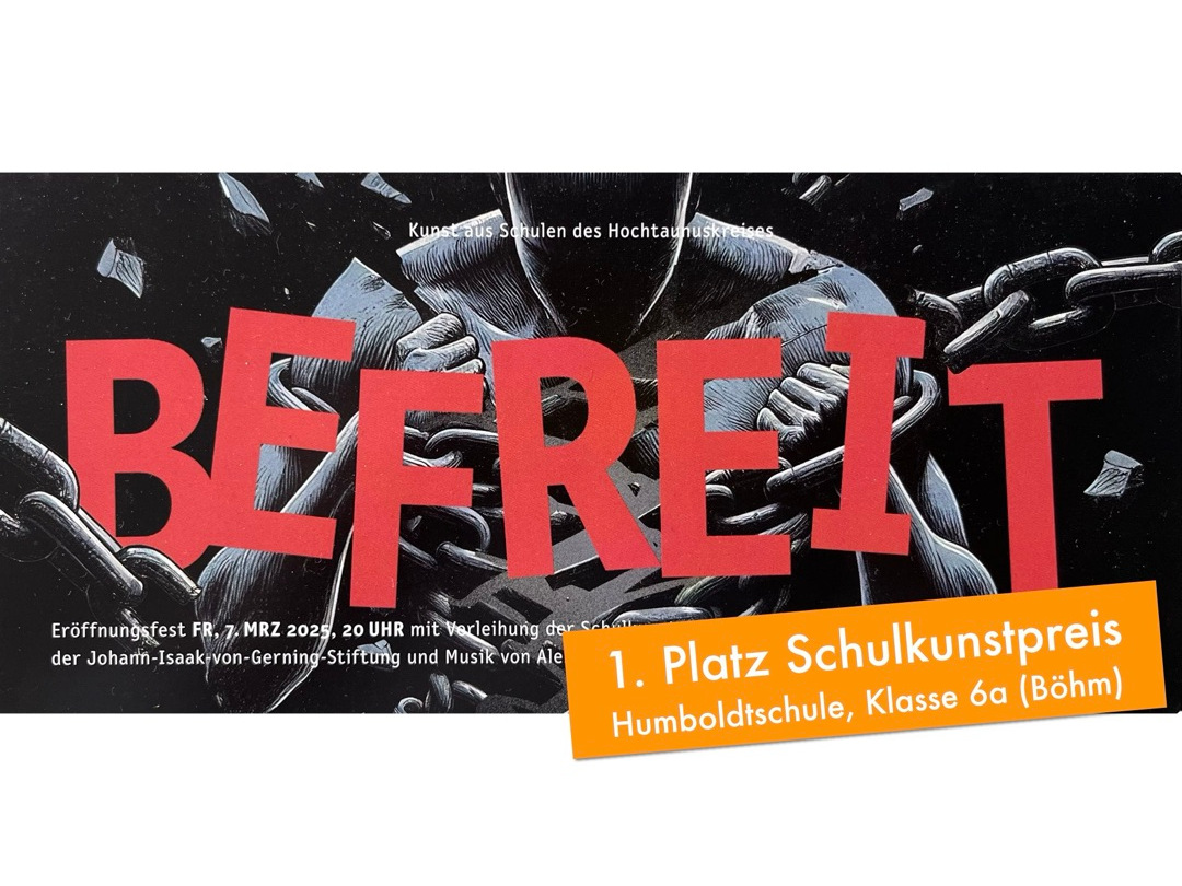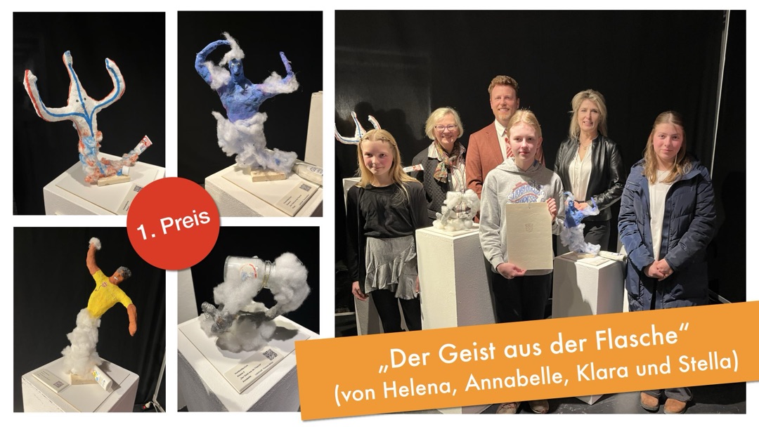 Unter dem diesjährigen Motto „befreit“ zeigten Schüler*innen der Humboldtschule (Klasse 6a, Herr Böhm) fantasievolle Kleinplastiken, die geheimnisvolle Geister zum Leben erwecken. Jeder Geist hat seinen ganz eigenen Ursprung: Er stammt aus einer besonderen Flasche, aus der er sich befreit hat. So begegnet uns etwa ein sonnenverwöhnter Geist aus der Sonnencreme-Flasche oder ein Zahnpasta-Geist mit pastenförmigem Körper und Bürstenkopf, der aus der Zahnpastatube entkommt. Die Arbeiten gewannen den 1. Platz beim Schulkunstpreis. Wir gratulieren!