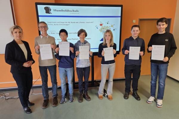Die Humboldtschule feiert erneut großartige Erfolge beim hessenweiten Experimentalwettbewerb „Chemie – mach mit!“ für die Sekundarstufe I.In der 48. Wettbewerbsrunde „Zitrone, Limette und Co.“ konnten gleich mehrere Teams Spitzenplätze erringen:Die Schülerinnen Anna Preibisch, Jara Winkler und Emilia Schumann erreichten wie schon im vorherigen Durchgang den 1. Platz in der Jahrgangsstufe 10.Die ...02.10.2025