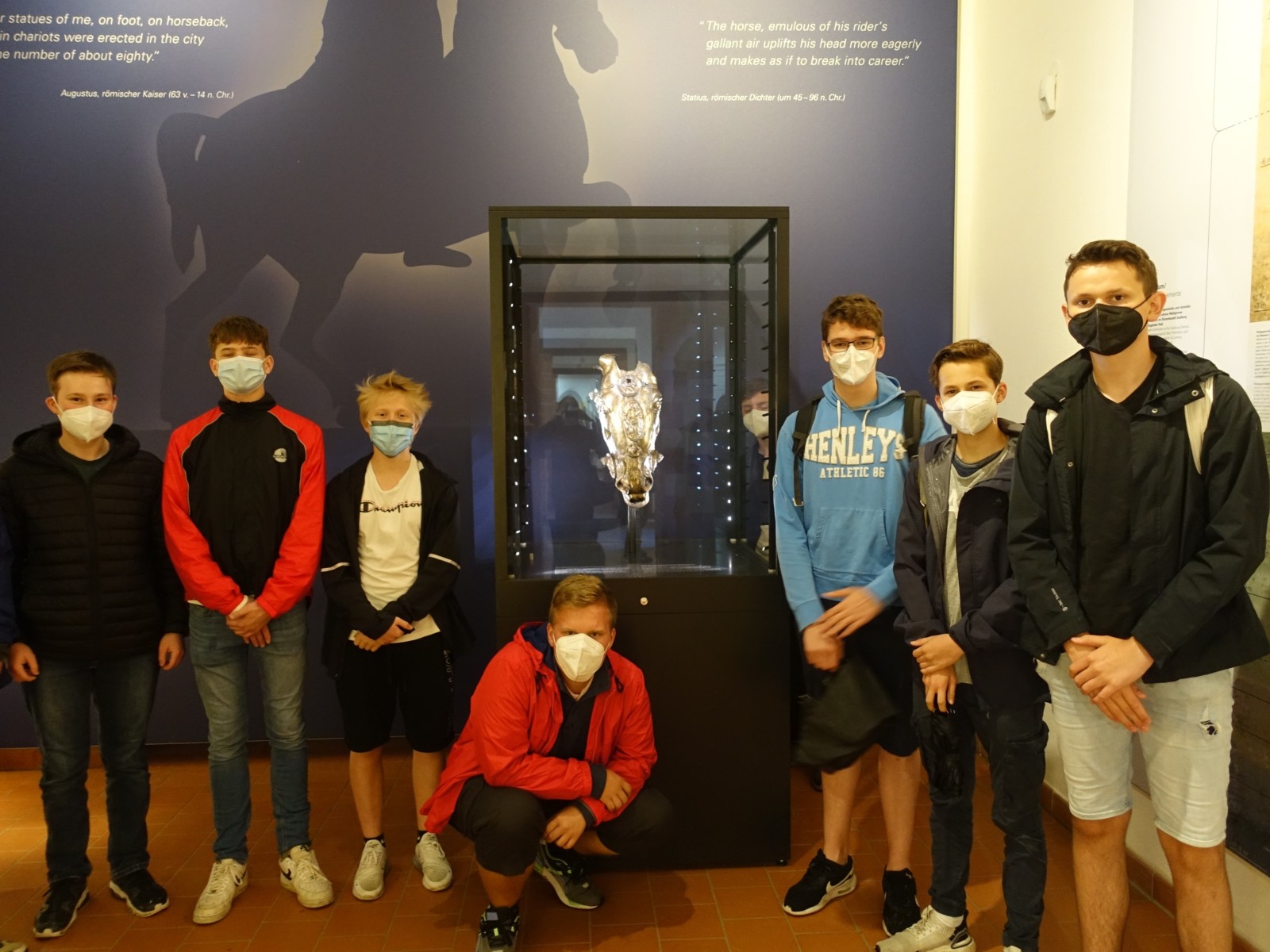 Einen weiteren Höhepunkt der Projektarbeit bildete die Exkursion des Jahrgang 9 zum Römerkastell Saalburg im Juli, wo nach der langen Zeit der Pandemie der Pferdekopf endlich im Original besichtigt werden konnte.Besonders hervorzuheben ist, dass dieses Projekt neben der Förderung von „denkmal aktiv“, der Deutschen UNESCO-Kommission e.V. und den Anwesenden an der Abschlussveranstaltung, also der Schulleitung der Humboldtschule, Frau Dr. Rasbach, Oberbürgermeister Hetjes, DUK-Koordinator Klaus Schilling, von vielen weiteren Personen und Institutionen unterstützt wurde: Saalburgmuseum (Herr Dr. Amrhein, Herr Herrmann), Deutsche Limeskommission (Frau Dr. Matesic), Landesamt für Denkmalpflege Hessen/Abteilung hessenARCHÄOLOGIE (Herr Dr. Mückenberger), Förderverein Römisches Forum Waldgirmes e.V. (Herr Grabowski). Bei allen möchten wir uns ganz herzlich bedanken!